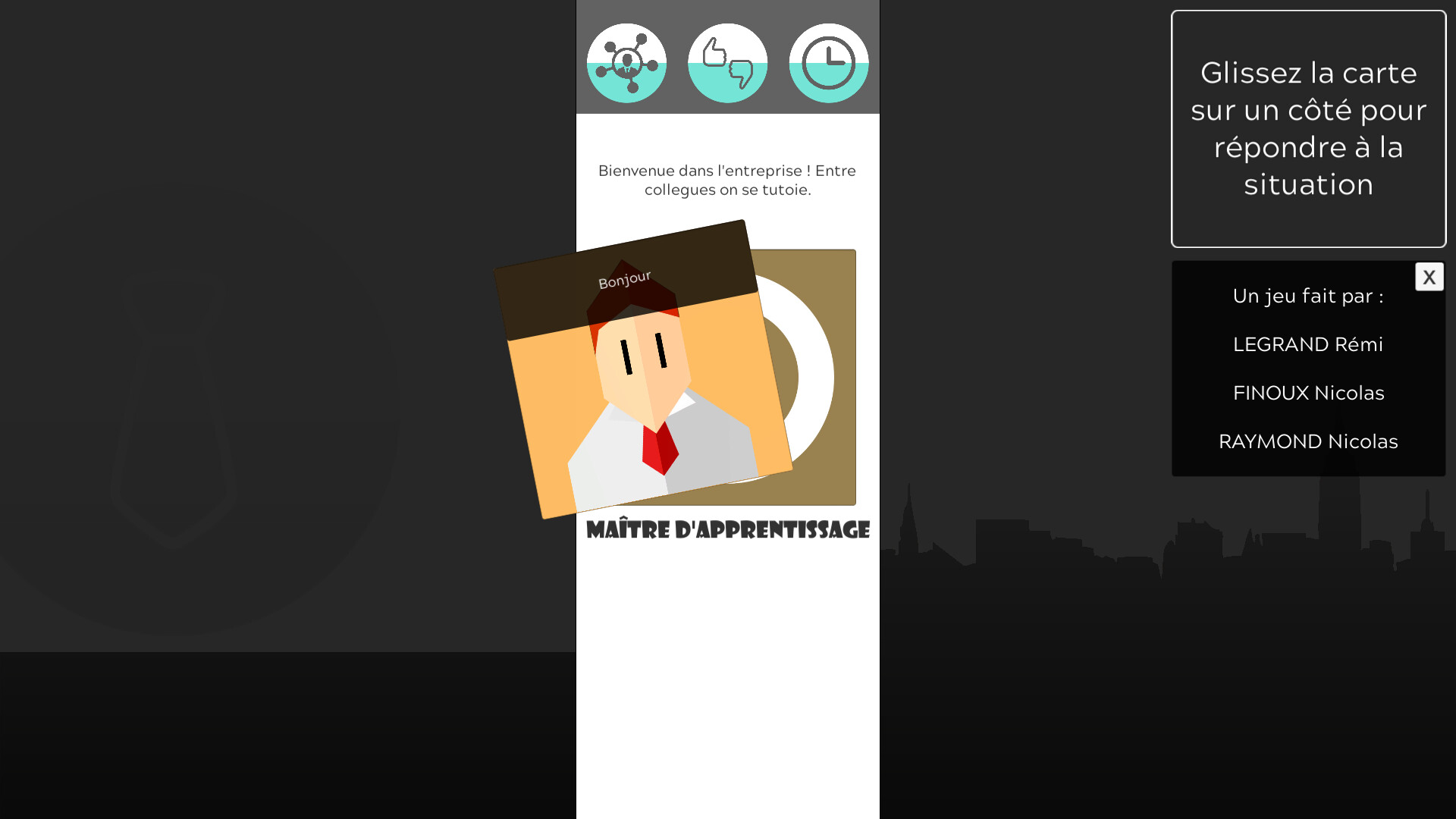 La façon de jouer à ce jeu est très simple, glisser une carte vers la gauche ou la droite avec la souris pour choisir une réponse à une situation. En fonction de votre réponse, vous pourriez changer les jauges de "social", "moral" et de "gestion du temps".