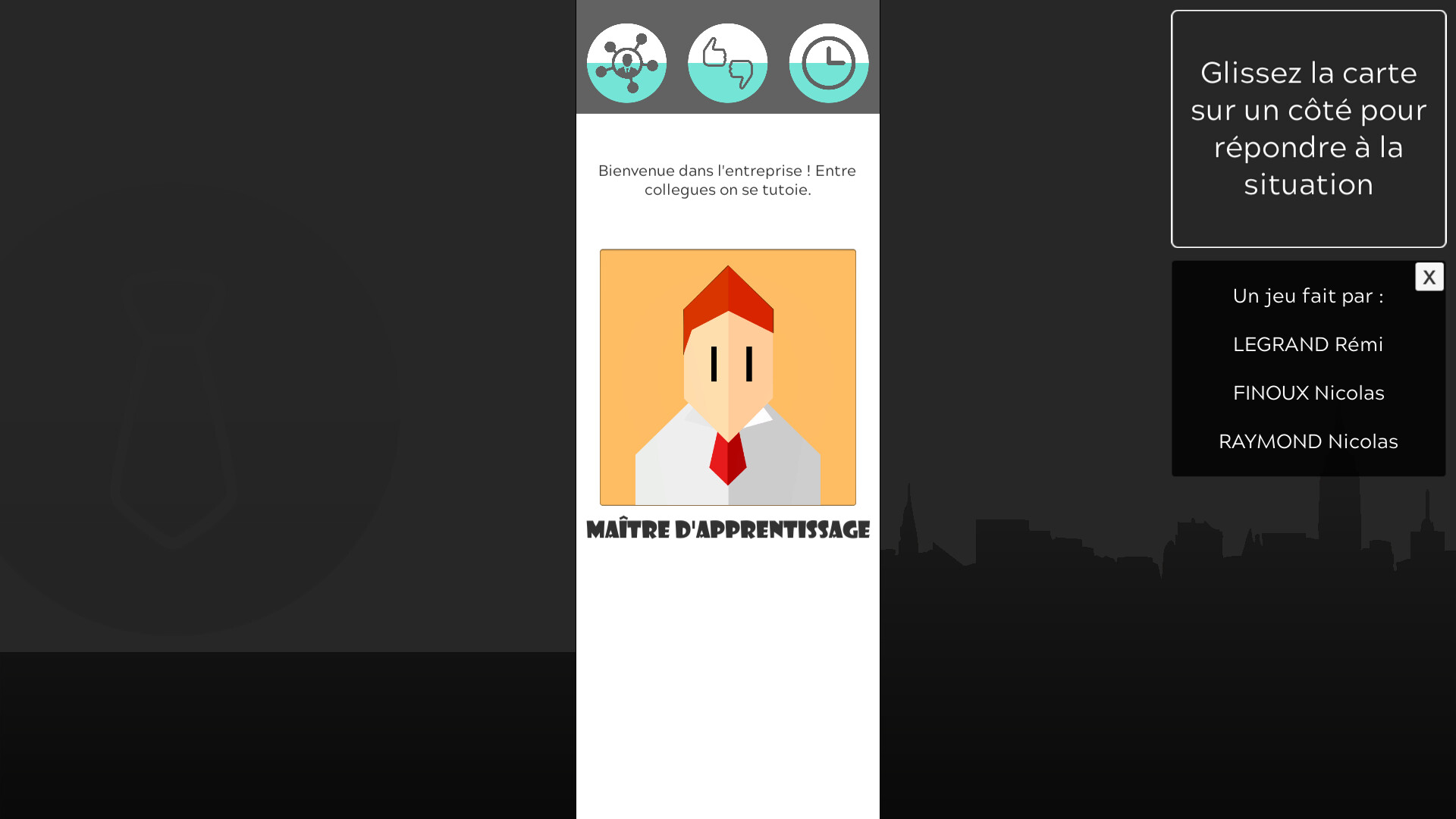 Ce petit jeu d'une durée de vie de quelques clics est né d'un projet visant à intégrer les prochaines générations d'apprentis STMN dans leur entreprise respective, en leur montrant quelques notions de management relationnel sur divers acteurs types du monde de l'entreprise.